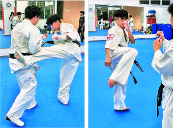 ▲新極真会福岡支部糸島道場で稽古に励む渡さん